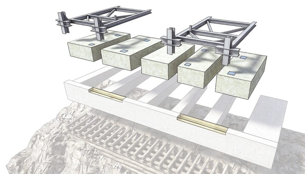 Um Raum für dieses neue System zu schaffen, wurde die Mauerkrone der Prallmauer punktuell und präzise eingeschnitten. Diese Eingriffe dienen ausschließlich der konstruktiven Freiheit und nicht der Lastaufnahme.
