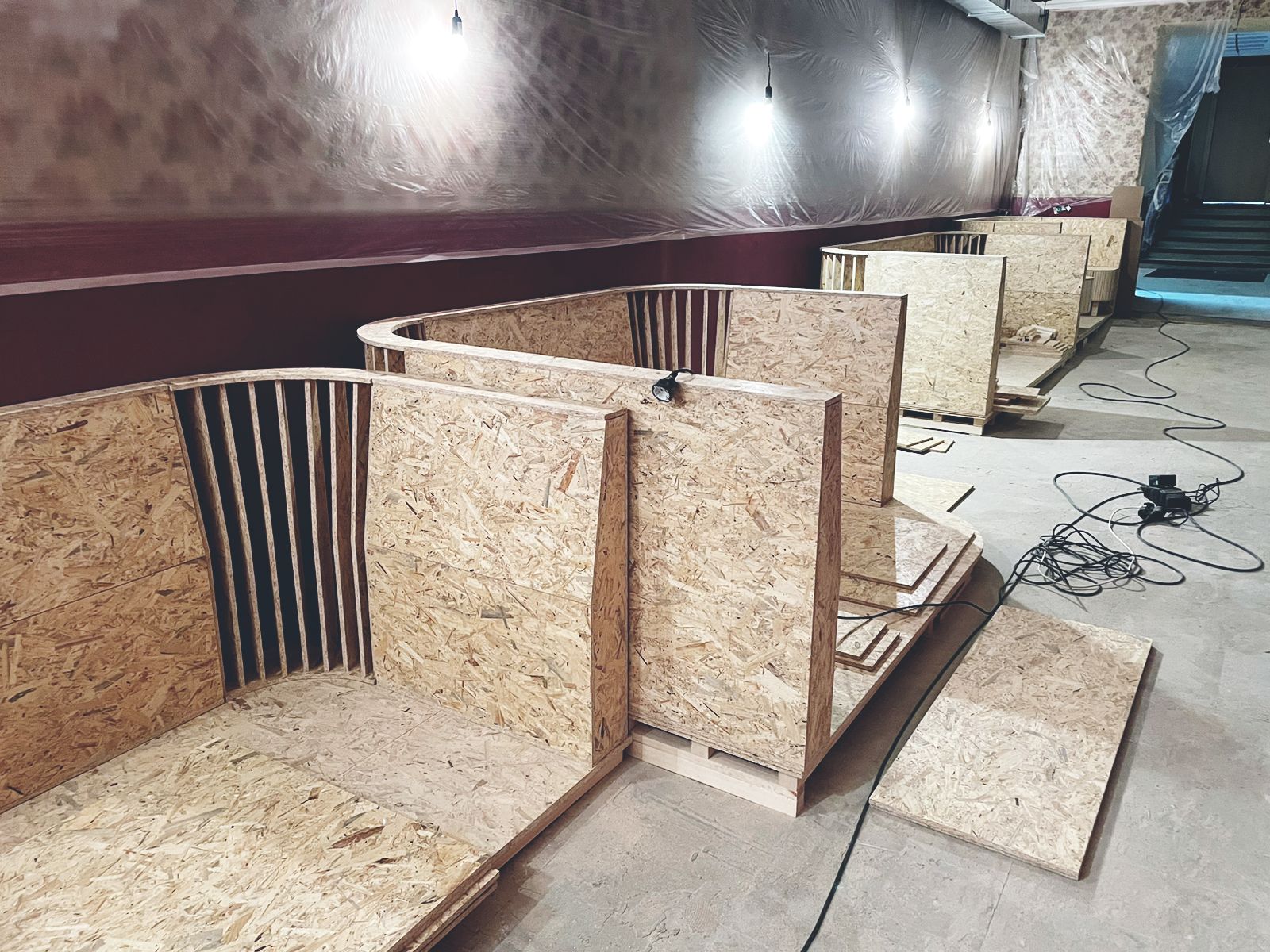 Die Umsetzungführt den Bestand über in ein zusammenhängendes System. Konstruktion, Technik und Nutzung werden neu geordnet und miteinander verzahnt. Die Räume werden nicht nur verbunden, sondern auf mehreren Ebenen miteinander verknüpft. Der Gastraum wird vom Durchgangsraum zum eigenständigen Aufenthaltsort – vor, während und nach der Aufführung.