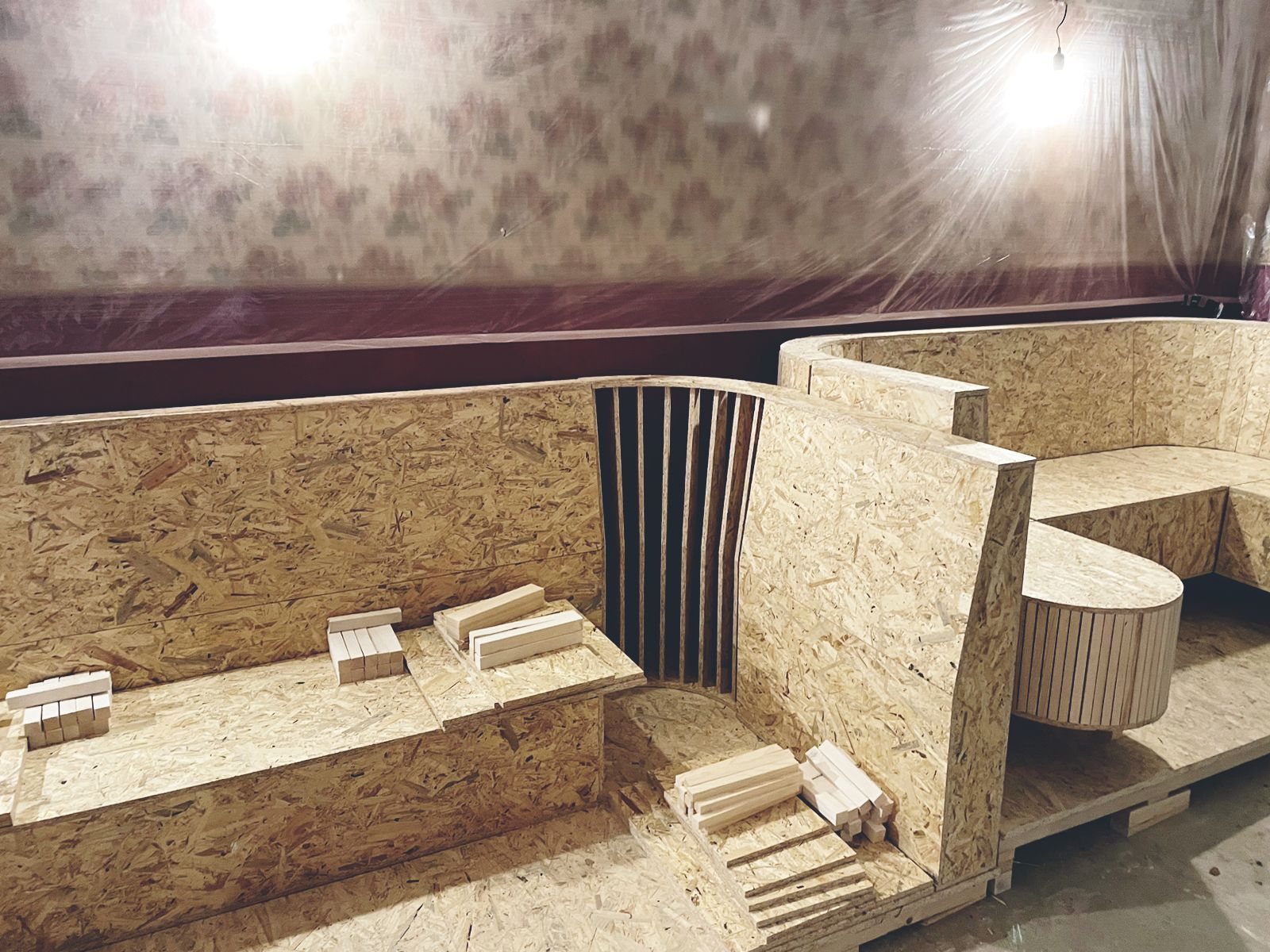 Die Möbeleinbauten wurden als integraler Teil der räumlichen Struktur entwickelt und von der ersten Skizze bis zur handwerklichen Ausführung vor Ort persönlich umgesetzt. Diese unmittelbare Verbindung von Entwurf und Bau ermöglichte eine präzise Anpassung an den Bestand. Standardisierte Elemente und wiederkehrende Details integrieren Leitungsführungen und technische Infrastruktur direkt in die Möbelobjekte.